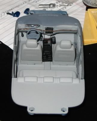 Here's a WIP pic of the interior to my Chevy Impala patrol car. I added the center radio console from the Lindberg Ford Crown Victoria kit. It was a royal pain in the ____ to remove the kit center. It was painted with Model Master interior fabric grey with the wood trim MM mahogany flight deck. As can be seen by the mirrors in the background, the body color will be Tamiya blue. I'm currently debating whether to add an arrow stick to the rear deck.